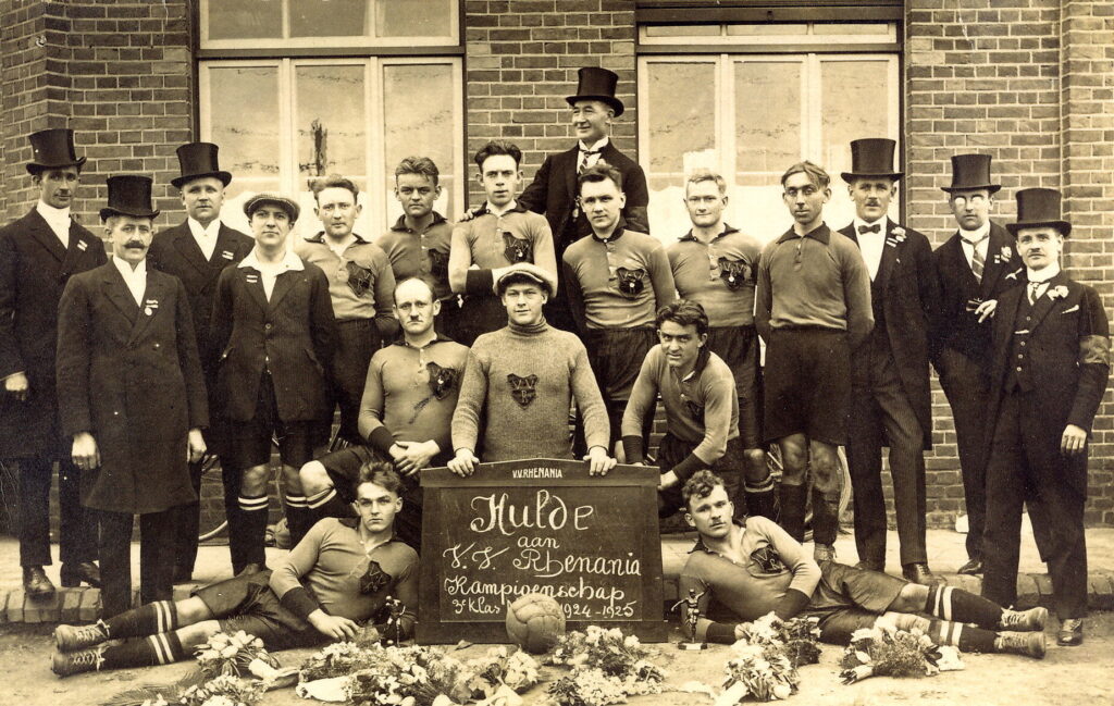 Het was op 9 mei 1920 dat een stelletje voetballiefhebbers bijeen waren in Café Muijs (het huidige café De Kroeg) op de Schinvelderstraat. Het doel was om tot oprichting van een voetbalclub te komen. Tevoren waren reeds drie pogingen mislukt. Ditmaal echter kwam de club tot stand en de naam werd “Rhenania”. De vereniging werd dus geboren in de Rozengaard. Staande de vergadering traden de volgende leden toe : P. Vandeberg, J. Vandeberg, A.J. Janssen, H. Even, J. Wijnbergen, M. Wijnbergen, H. Hof, K. Reitsma, T. Reitsma, L. Frijns en C. Elands. Het bestuur werd als volgt samengesteld : J. Janssen, voorzitter, C. Elands, secretaris en J. Vandeberg, penningmeester. Op de oprichtingsvergadering moest ieder lid onmiddellijk 4,50 gulden (€2,05) betalen voor dekking der eerste onkosten, verder werden nog per hoofdelijke omslag de doelpalen en ballen berekend. Buitendien had ieder nog de aanschaffingskosten van de kleding. Voor het eerste speelveld werd gekozen voor een terrein aan de Schinvelderstraat.