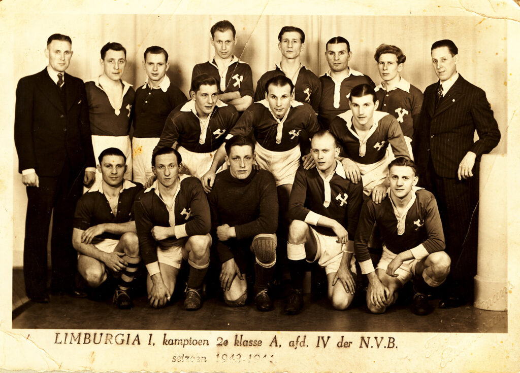 Het seizoen 1943-1944 bracht ons het kampioenschap. Rechtstreekse promotie was niet mogelijk omdat het seizoen 1942-1943 geen promotie- en degradatieregeling had gekend. Derhalve moesten we twee beslissingswedstrijden spelen tegen de kampioen van dat seizoen nl. Waubachse Boys. De eerste wedstrijd werd in Waubach gespeeld en hier verloren we met 1-0. De tweede wedstrijd in Brunssum werd echter op overtuigende wijze met 8-1 gewonnen. Door deze overwinning werd Limburgia in de gelegenheid gesteld de promotiewedstrijden te spelen tegen Sittardse Boys (het huidige Fortuna Sittard), VVV, Goes en TSC. Limburgia eindigde op de eerste plaats en promoveerde naar de eerste klas.