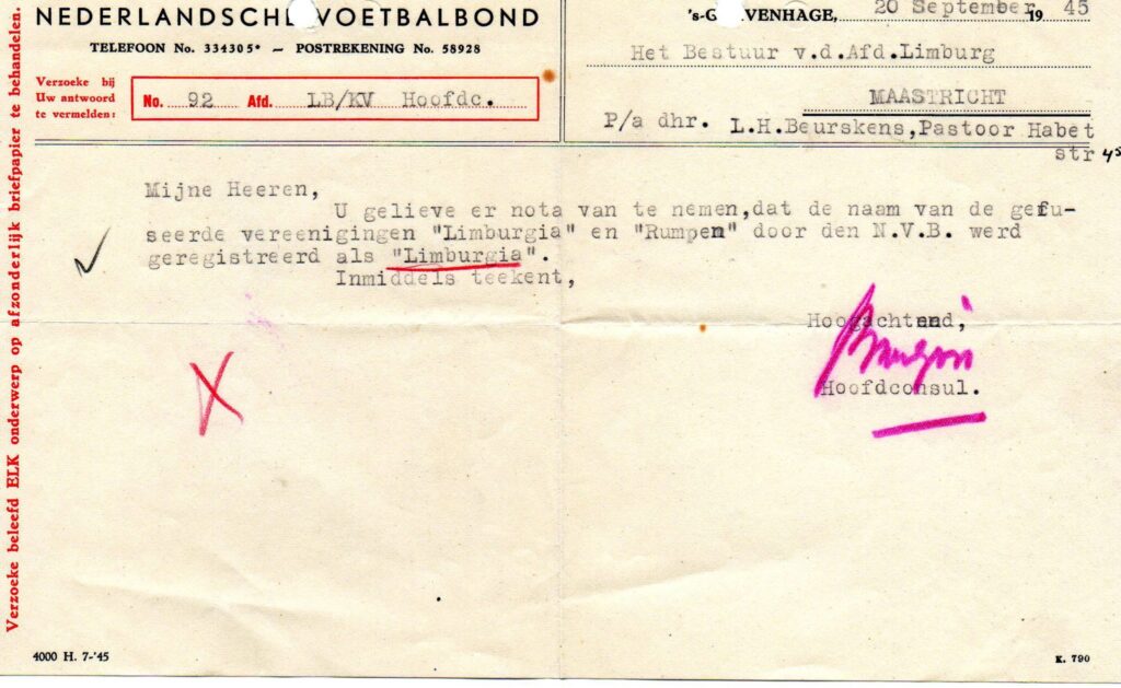 Het seizoen 1944-1945 werd na drie wedstrijden stilgelegd vanwege de oorlogsomstandigheden. Op initiatief van Limburgia werd besloten om over te gaan tot het spelen van een noodcompetitie. Direct na de bevrijding werd getracht een fusie tot stand te brengen tussen de RK Voetbalvereniging Rumpen en Limburgia. Na diverse vergaderingen over dit punt te hebben gehouden, werd in de Buitengewone Algemene Vergadering van 28 januari 1945 een fusie tussen beide verenigingen gesloten en werd er een Geestelijk Adviseur aan de vereniging toegevoegd.