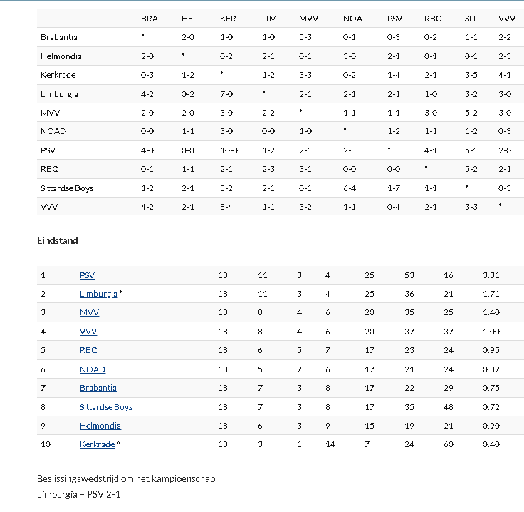 De spanning ontlaadde zich à la minute in een daverende geestdrift en in triomf werden onze dappere elf op de schouders van het terrein gedragen. SV Limburgia was kampioen! Voor de tweede maal in onze voetbalhistorie werd het kampioenschap in de 1e klasse behaald! Was het een wonder dat de vreugderoes geen einde scheen te nemen? Als eerste trad dhr. v.d. Bosch aan, die de kampioenen hulde bracht voor dit kranige competitiebesluit en hen veel succes toewenste in de komende kampioenswedstrijden. De PSV voorzitter, dhr. Voorwinde , omhing aanvoerder Willy met een fraaie lauwerkrans en wenste ons geluk met het behaalde resultaat. Hij sprak zijn dank uit voor de faire wedstrijd en hoopte dat SV Limburgia met dezelfde energie het zuiden in de strijd om het landskampioenschap zou vertegenwoordigen. Voorzitter van Daalen was de volgende spreker en met een hartelijke speech en een 2e lauwerkrans bracht hij hulde namens VVV.